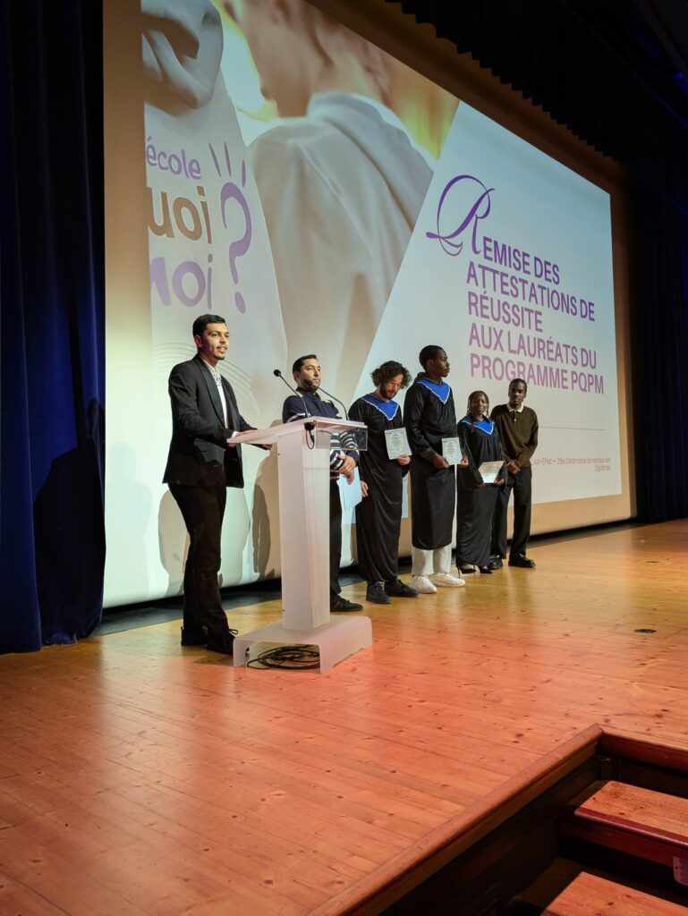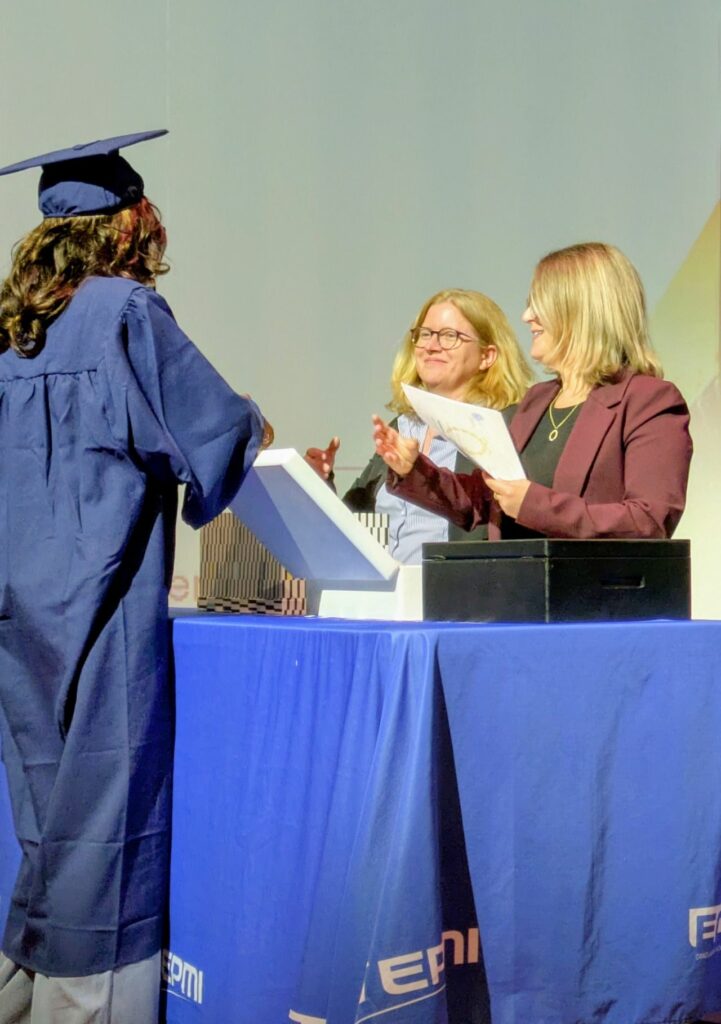 La cérémonie s’est poursuivie par la présentation du programme PQPM (« Une Grande École, Pourquoi Pas Moi ? ») – mené en coopération avec plusieurs établissements du Val-d’Oise et dédié à l’accompagnement de jeunes issus de quartiers défavorisés – par le Président de l’association ÉLAN et M. Thibaut Forvarin, enseignant à ECAM-EPMI et référent du programme PQPM au sein de l’École. À cette occasion, les élèves participant au programme ont été invités à monter sur scène pour recevoir leurs attestations de réussite en présence de la Directrice, du Président de l’École et de la Marraine de la promotion 2025.