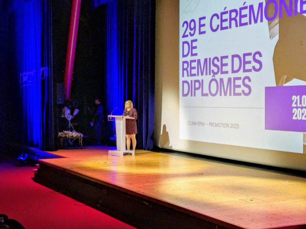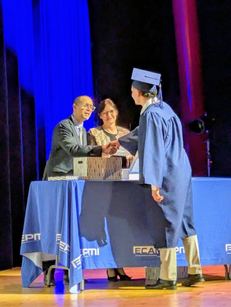 Vint le tour de la remise des diplômes d’Ingénieur Spécialisé en Génie Énergétique et Climatique, effectuée de main de maître par Mme Julia Luthier, Directrice du Cycle d’Ingénieur par l’Apprentissage, et M. Rafik Absi, Directeur de la Recherche à ECAM-EPMI.