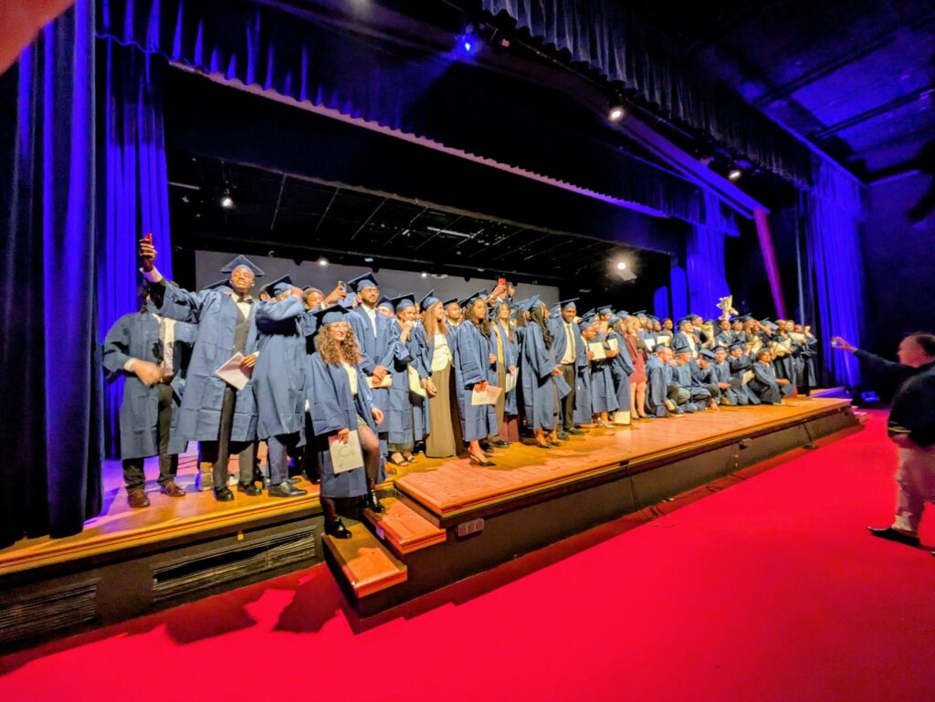 Ensuite, nous eûmes la joie de voir les ingénieur(e)s généralistes recevoir leurs diplômes des mains de Mme Darcherif et de Mme Nadine GOMES, sous les applaudissements d’un public nombreux et chaleureux qui a pu célébrer l’instant magique du fameux « lancer de chapeaux » par une standing ovation !
